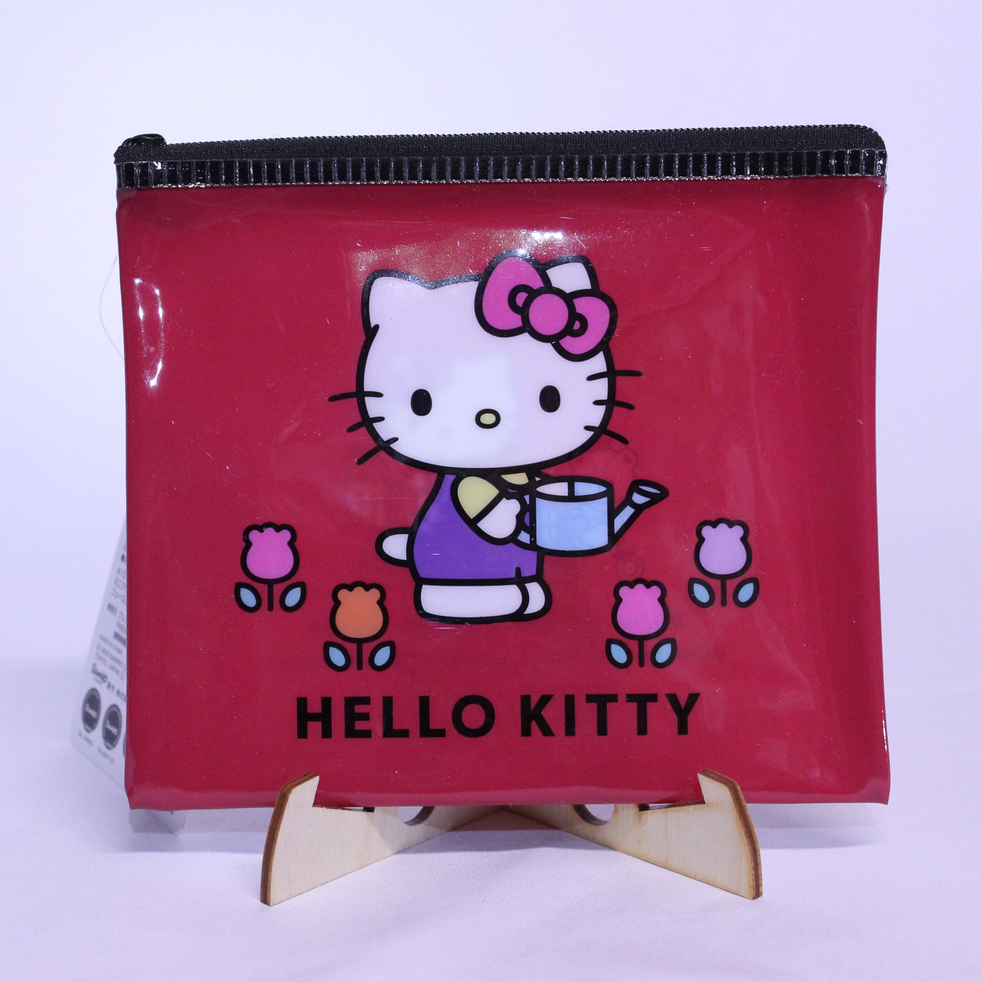 Mini vinyl makeup bag with Hello Kitty watering flowers on the front and riding a bike on the back.