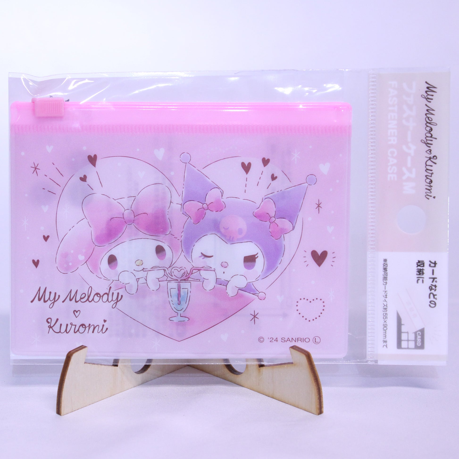 Mini vinyl card pouch with slider closer showing My Melody & Kuromi sharing a drink!
